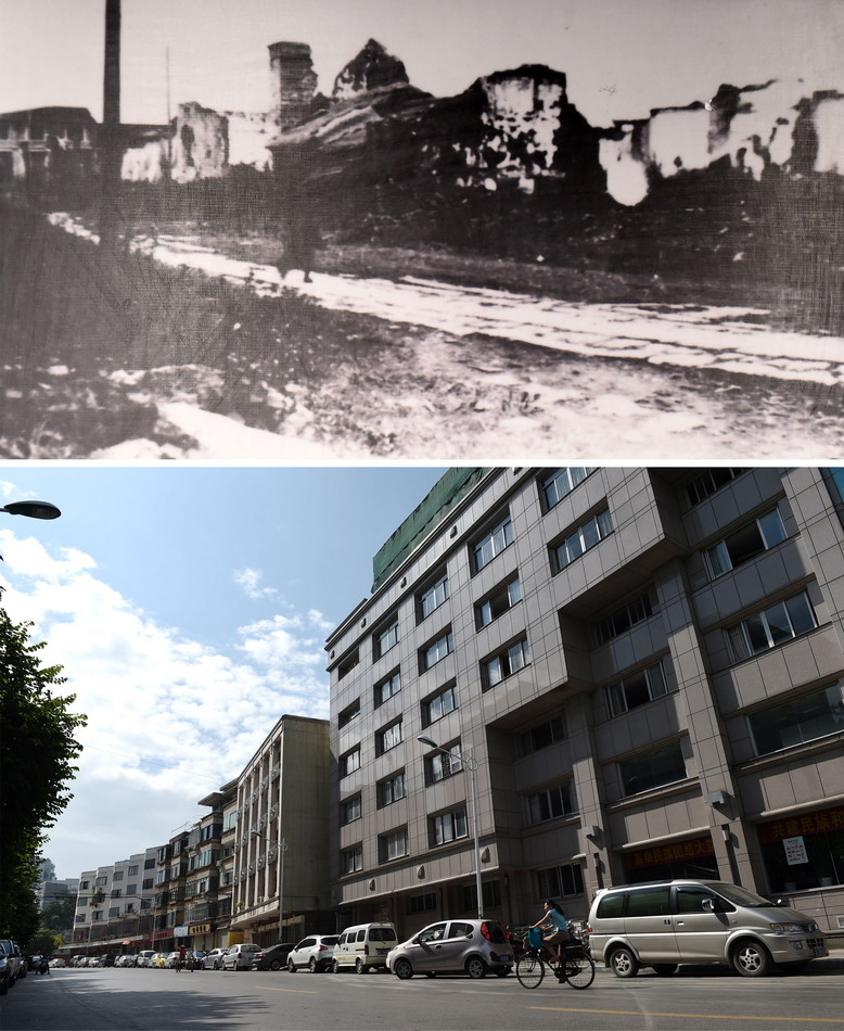 上图:这是被侵华日军炸毁的桂林市五美路的景象(资料照片)。下图:9月1日,市民骑车从桂林市五美路经过。