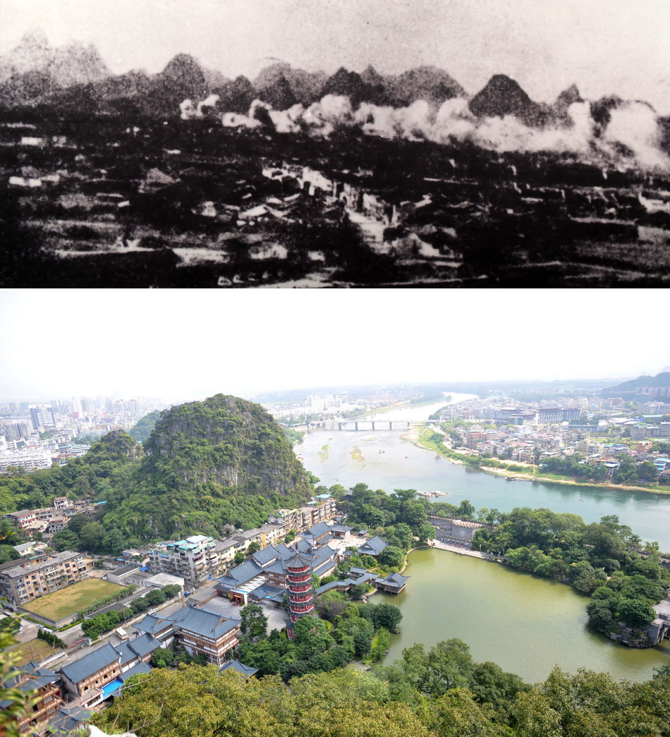 上图:这是被侵华日军轰炸后的桂林市区景象(资料照片)。下图:这是2012年8月20日拍摄的桂林市区新貌。