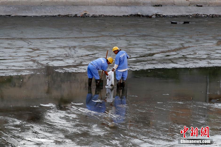 9月4日,工人在故宫筒子河里人工清淤。近日,故宫筒子河启动“洗泥”工程,为保护文物,清淤将全部采用人工挖掘。据悉,这是1998年以来筒子河的首次清淤,“十一”前7600立方米淤泥将全部清理完毕并从北海引水注入。届时,曾拱卫皇家禁苑的“御河”将清澈见底重现碧水绕城的美景。中新社发 韩海丹 摄