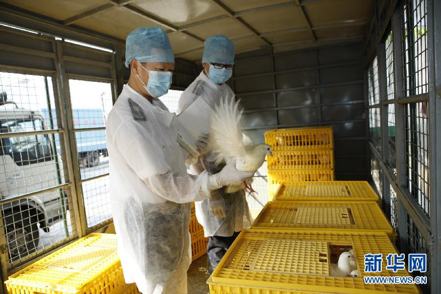 9月4日,深圳文锦渡检验检疫局工作人员对运往香港的活鸽进行检验检疫。香港停止输入内地活家禽7个月后,9月4日起恢复供应。9月4日上午,首批约500只活家禽经文锦渡管制站进口并抽取样本测试后,被运抵长沙湾批发市场。新华社发(李坚强 摄)