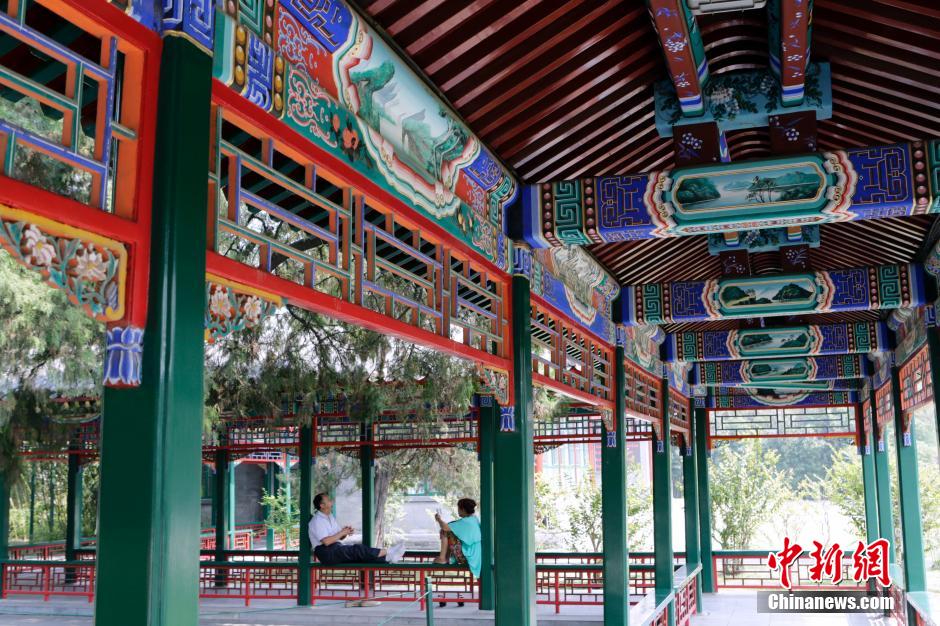 9月5日,游人在油饰一新的北京中山公园长廊中游览、休息。当日,北京中山公园长廊油饰修缮工程全部结束,并向游客开放。中新社发 李慧思 摄