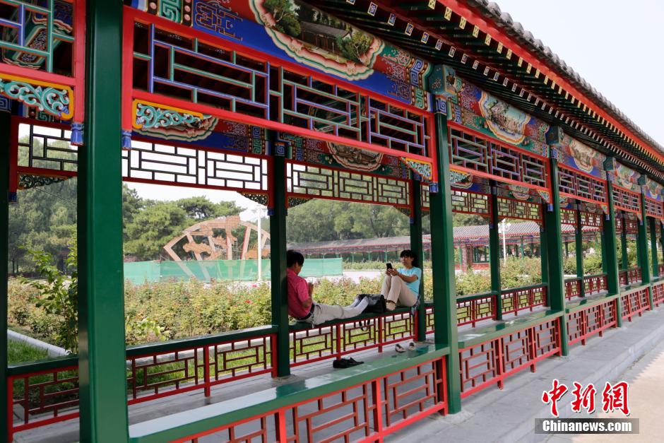9月5日,游人在油饰一新的北京中山公园长廊中游览、休息。当日,北京中山公园长廊油饰修缮工程全部结束,并向游客开放。中新社发 李慧思 摄