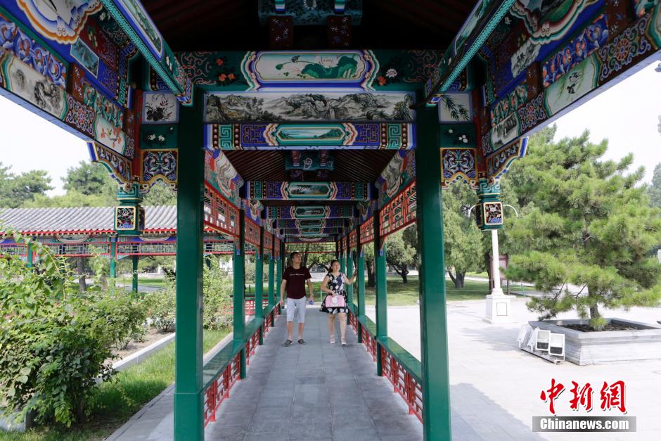 9月5日,游人在油饰一新的北京中山公园长廊中游览、休息。当日,北京中山公园长廊油饰修缮工程全部结束,并向游客开放。中新社发 李慧思 摄