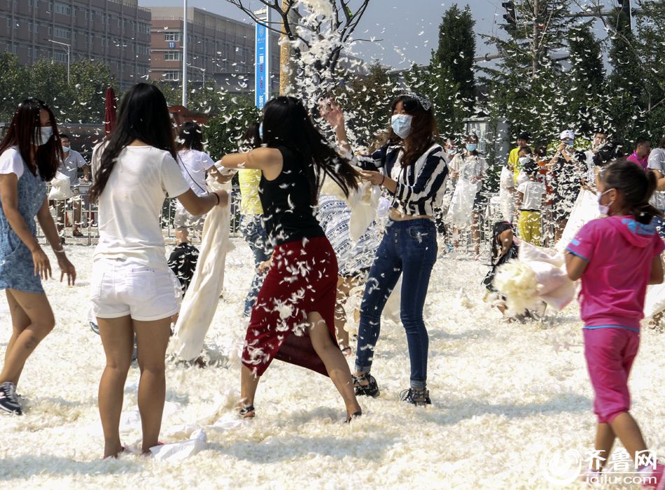 图为“枕头”大战现场,美女帅哥齐上阵,场面壮观。(齐鲁网发 薄恩岐 摄)
