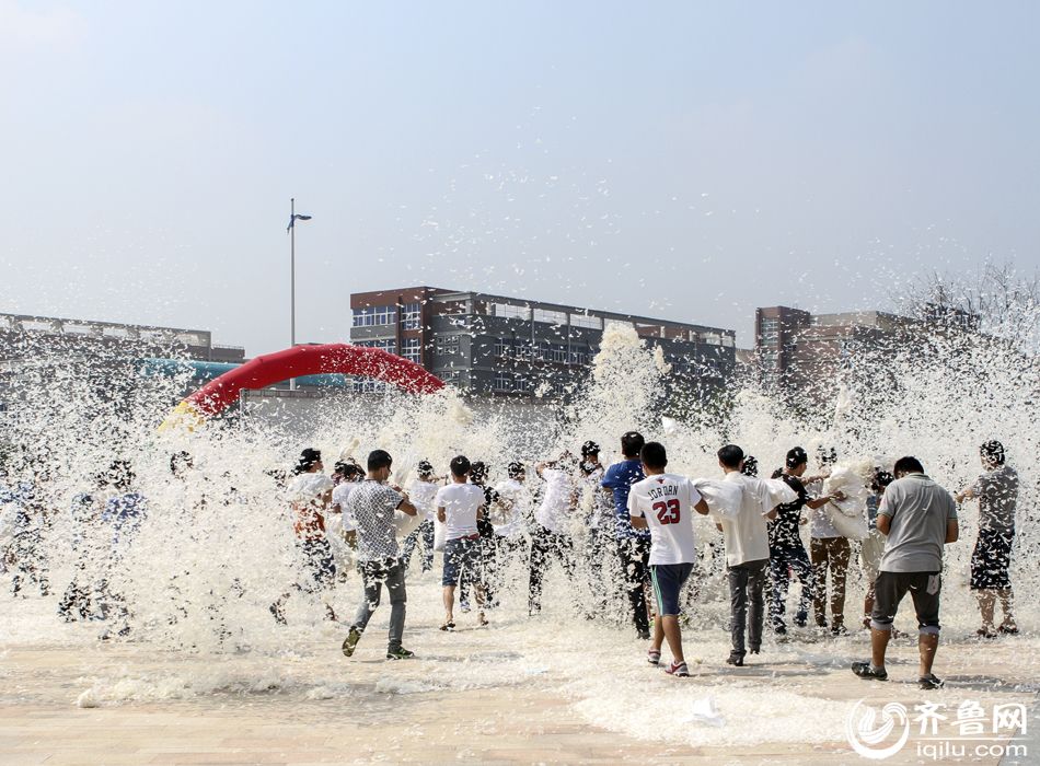 图为活动现场,美女帅哥手拎羽绒枕头相互作战,羽绒漫天纷飞,场面壮观。(齐鲁网发 薄恩岐 摄)
