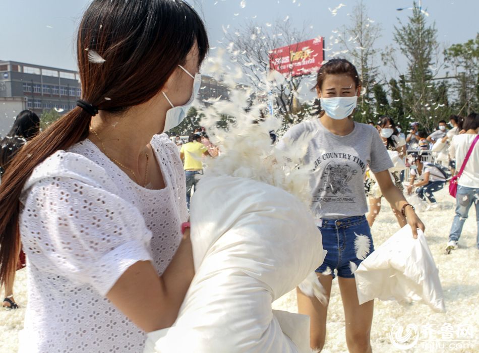 图为“枕头”大战现场,市民激情酣战,释放压力。(齐鲁网发 薄恩岐 摄)