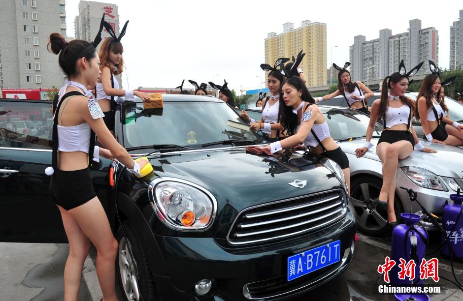 9月8日中秋节,一场集结了兔女郎、摇滚、快闪等元素的“洗车狂欢趴”在石家庄一超市广场火爆启幕。近百位兔女郎,在摇滚乐队演绎的音乐中与车友上演浪漫邂逅,并现场洗车。中新社发 翟羽佳 摄