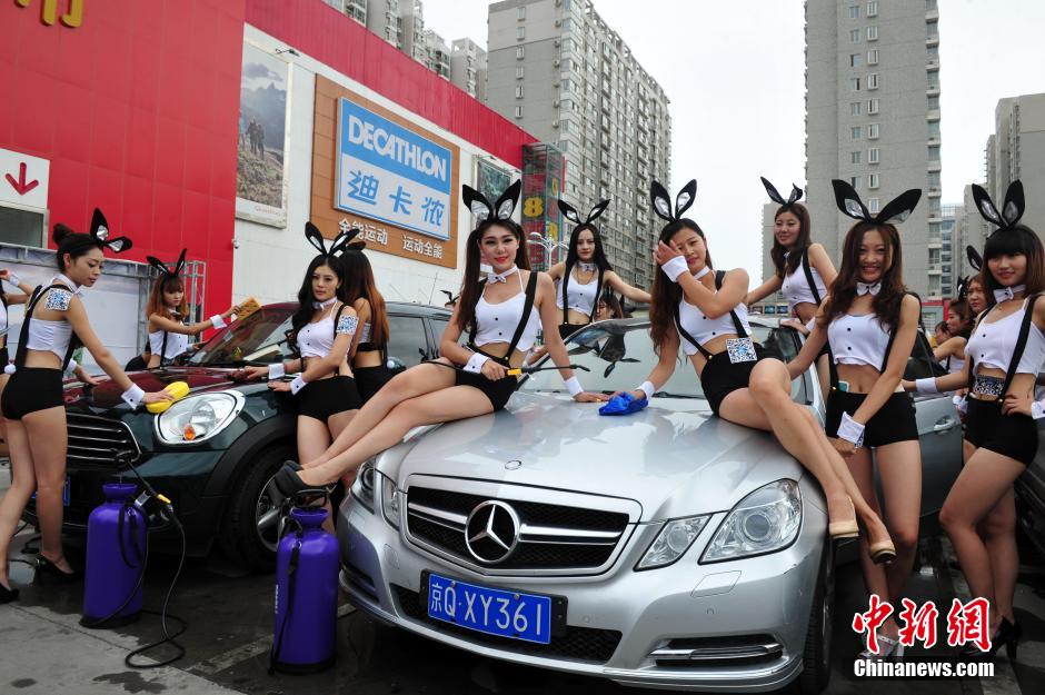 9月8日中秋节,一场集结了兔女郎、摇滚、快闪等元素的“洗车狂欢趴”在石家庄一超市广场火爆启幕。近百位兔女郎,在摇滚乐队演绎的音乐中与车友上演浪漫邂逅,并现场洗车。中新社发 翟羽佳 摄