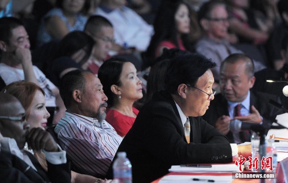 当地时间9月7日晚,“CCTV《我要上春晚》2014美国节目选拔”总决赛在洛杉矶举行,来自洛杉矶、旧金山、德州、芝加哥、纽约和华盛顿特区的33个节目参加了比赛。图为由中国著名影视明星唐国强、孙海英、吕丽萍,以及多次获得格莱美奖的美国著名音乐家Jerry Bell等组成的专家评审组。中新社发 毛建军 摄