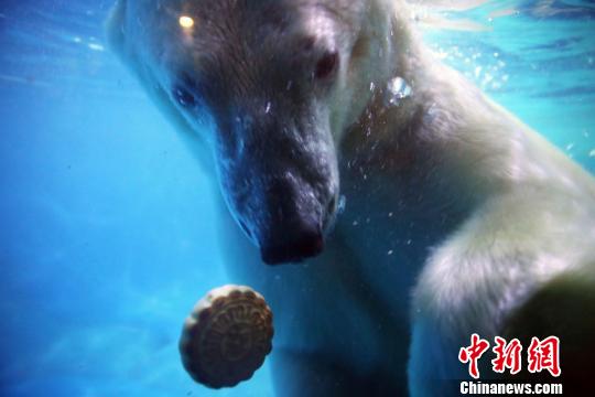7日,山东蓬莱海洋极地世界的工作人员为北极熊莱斯和它的“妻子”蓬蓬准备了特制月饼和蔬菜水果沙拉,让北极熊“夫妻”也过上一回“中秋节”。姜山 摄
