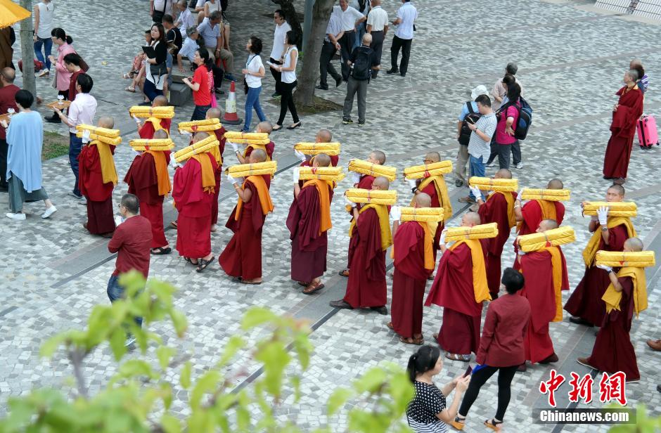 9月8日,近百名僧伽及信众列阵抬起103卷《大藏经》,绕行九龙尖沙咀,希望将爱、慈悲、智慧等正能量传递到香港每个角落,化解矛盾纷争,社会和谐安定。这是第十届香港噶举大祈愿法会的活动之一,众僧伽及信众分三日绕行了香港岛、九龙、新界,祈福香港。中新社发 张宇 摄