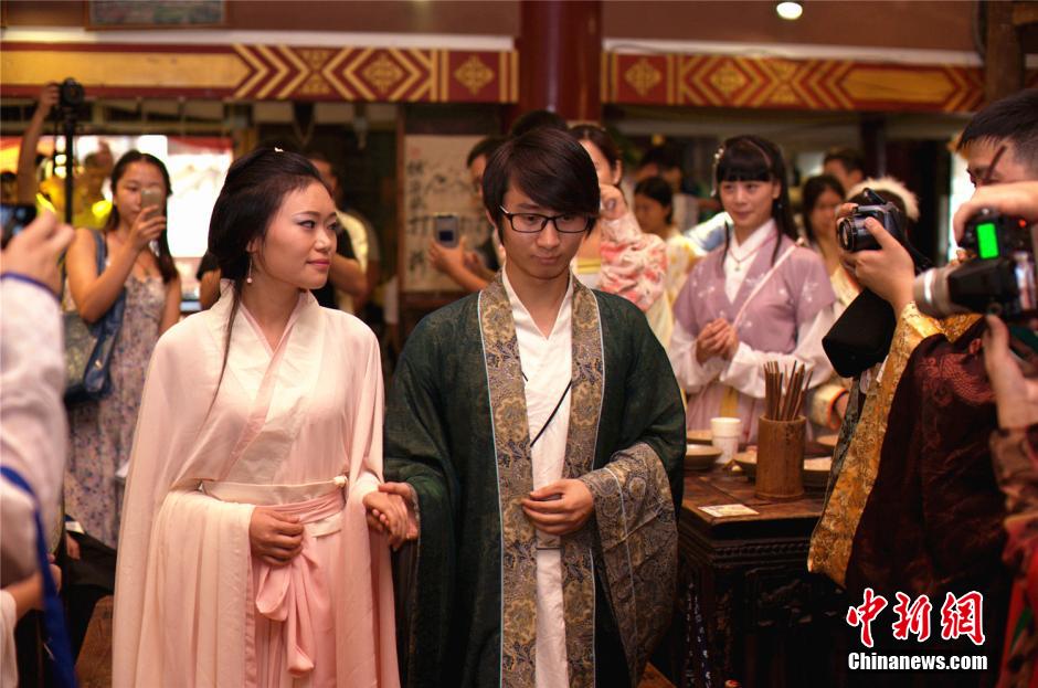 9月8日中秋佳节,“90后”青年李泽伟(刘韵)在重庆千年古镇磁器口,采取传统周制婚前礼向相恋四年的恋人求婚,上演一场凤冠霞帔、花园月圆的浪漫情事。李泽伟和女友相恋之后共同爱上传统文化,此后两人把此爱好变成事业,一起创立了“汉风体验馆——汉韵雅舍”。经过四年的相依相守,李泽伟决定在中秋佳节给女友一个惊喜,按照周礼的三书六礼,用周制婚前礼的方式,向女友求婚。据了解,中国传统婚礼中的“三书六礼”包括纳采、问名、纳吉、纳征、请期、聘书、礼书、婚书,均在这个特别的求婚仪式上得到完整的体现。刘渝 摄