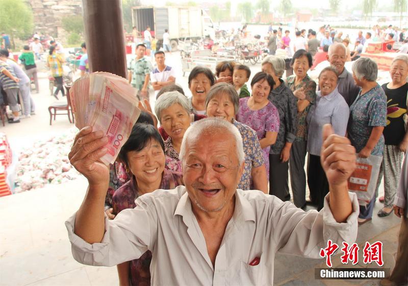 2014年9月6日,今年中秋节前夕,河北邯郸,民营企业家兼东街村党支部书记宋福如拿出80万元给全村老少发放福利。图为一老人高兴地展示刚领到的生活补助金。