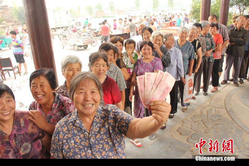 2014年9月6日,今年中秋节前夕,河北邯郸,民营企业家兼东街村党支部书记宋福如拿出80万元给全村老少发放福利。图为一老人高兴地展示刚领到的生活补助金。