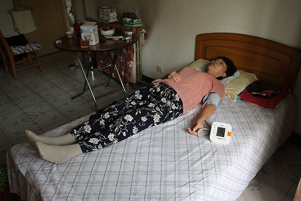 天涯明月共此时,2014年的这个中秋节距马航MH370失联已过去整整半年。澎湃新闻记者走进失联乘客家属的家中,平静之下,有着六个月前亲人的生活痕迹,和那颗难以愈合的心。图为9月7日,61岁的戴淑琴,躺在床上测量血压。她的妹妹一家五口人去马来西亚旅游,搭乘了失联航班MH370回国,至今该飞机还没有踪影。失联事件发生后,戴淑琴搬回老宅一个人生活,为妹妹奔走。血压计是妹妹送她的,马航事件发生后,她血压上升,每天都要测量一次。她最大的愿望就是妹妹一家人能够回来。(图/文 澎湃新闻 权义)
