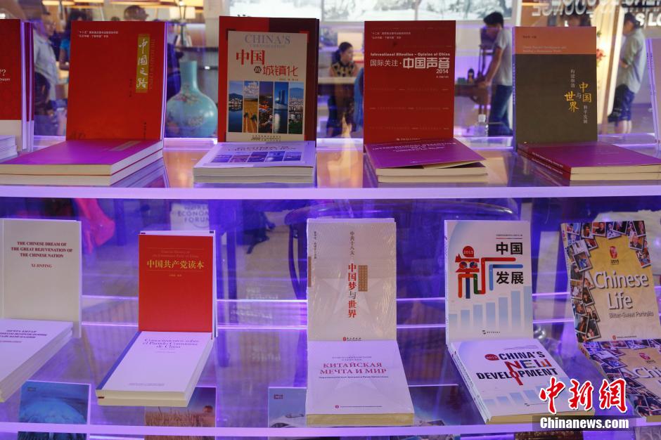 9月9日,天津梅江会展中心,介绍中国的书籍摆在中国·天津展示区的书架上。2014年夏季达沃斯论坛将于9月10日至12日在天津梅江会展中心举行。中新社发 刘关关 摄