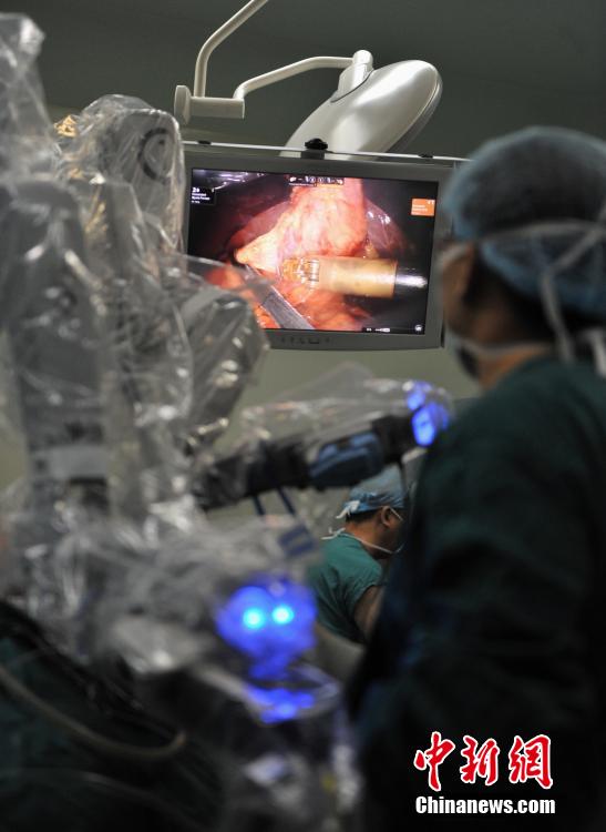9月9日,手术机器人系统首次在四川走上手术台。当日,四川首台手术机器人系统在四川省人民医院完成第一例手术,手术系统主要由医师操控台、床旁机械臂手术系统和3D成像系统组成,总价超过3000万元人民币。达芬奇手术机器人系统是全球唯一可以用于人体手术的人工智能辅助的腔镜手术系统,医生通过操控搭配在机器手臂上的仿真手腕手术器械,从而完成外科手术。中新社发 刘忠俊 摄