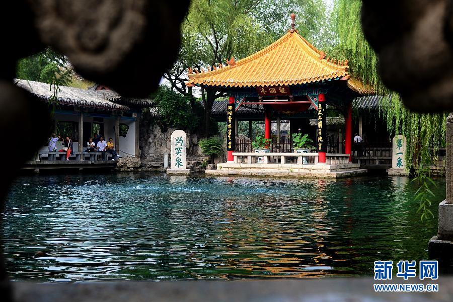 9月10日,游客在济南趵突泉畔赏泉。