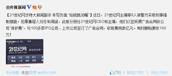 @央视新闻:【21世纪网涉特大新闻敲诈专写负面"给钱就闭嘴"】近日,21世纪网主编等8人被警方采取刑事强制措施。犯罪嫌疑人刘冬和周斌,此前分别任21世纪网CEO和主编,他们以签所谓广告合同收公司"保护费",与100多家IPO公司、上市公司签订了广告合同,收取费用数亿元。有时删帖要收100万!