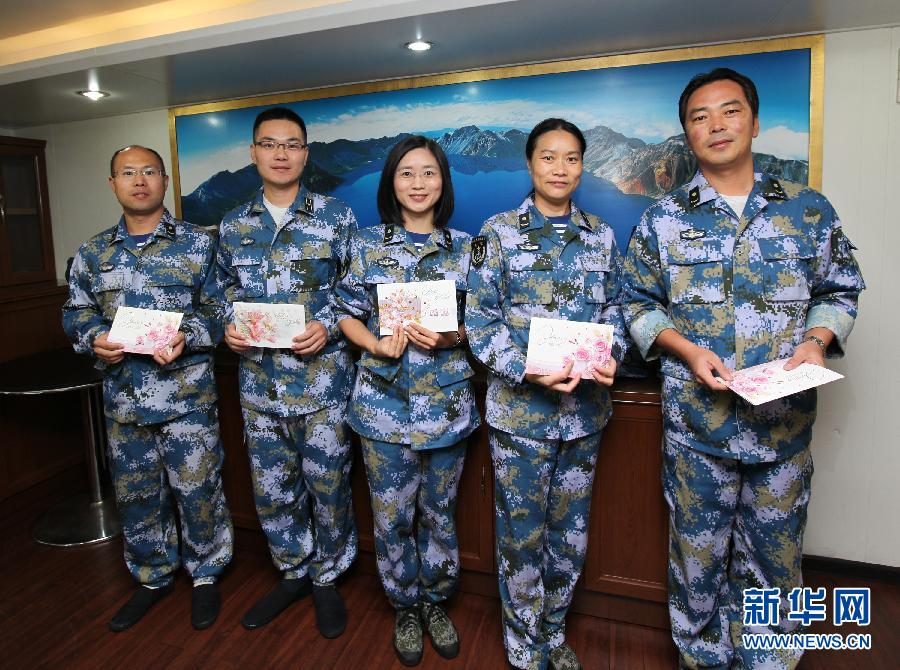 9月10日,在中国海军第十八批护航编队长白山舰上,来自不同学院的5位教师合影留念。中国海军第十八批护航编队目前正在亚丁湾海域执行护航任务。在护航编队指挥舰长白山舰上,有5名来自不同院校的教师。当地时间9月10日,他们在长白山舰上度过了一个不寻常的教师节。新华社记者张月琳摄