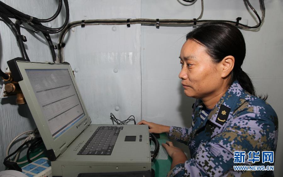 9月10日,在中国海军第十八批护航编队长白山舰海图室,来自海军指挥学院外训系的副教授陈永芳在监看翻译相关信息。中国海军第十八批护航编队目前正在亚丁湾海域执行护航任务。在护航编队指挥舰长白山舰上,有5名来自不同院校的教师。当地时间9月10日,他们在长白山舰上度过了一个不寻常的教师节。新华社记者张月琳摄