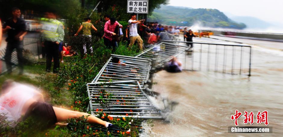 9月11日,农历八月十八,一年一度的钱塘江潮水达到顶峰,钱江沿岸聚焦数万观潮者。在九溪珊瑚沙水闸,潮水的冲击力极强,掀翻护栏、电动车和观潮人群,多人受伤。中新社发 陈加华 摄