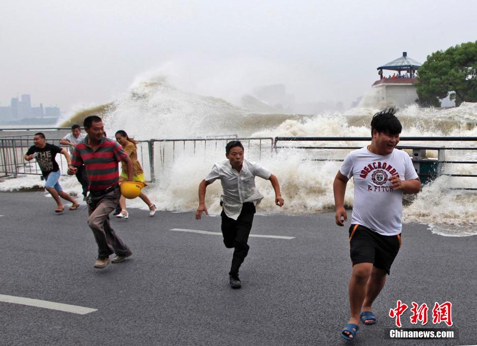 9月11日,农历八月十八,一年一度的钱塘江潮水达到顶峰,钱江沿岸聚焦数万观潮者。在九溪珊瑚沙水闸,潮水的冲击力极强,掀翻护栏、电动车和观潮人群,多人受伤。中新社发 陈加华 摄
