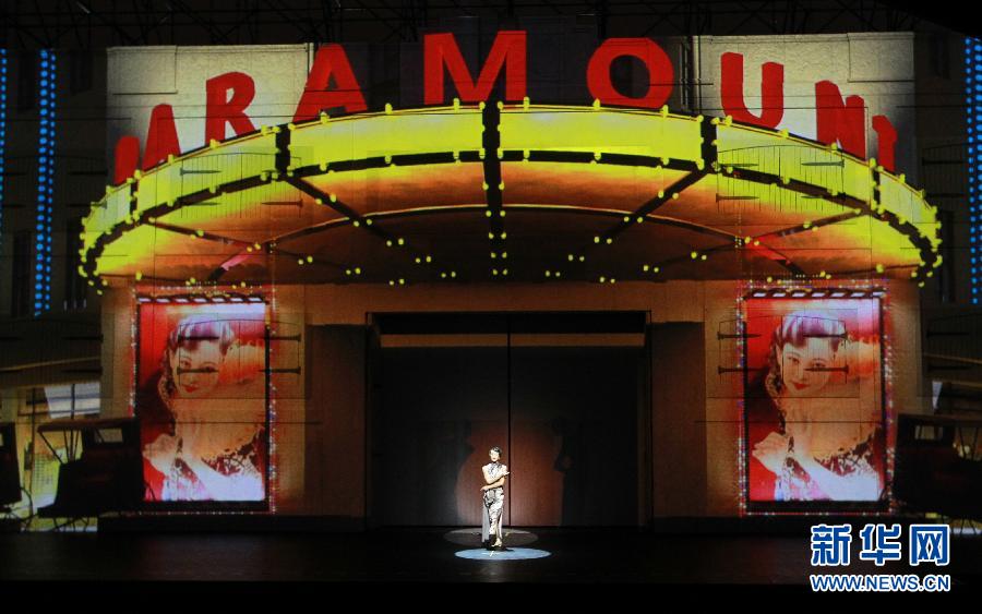 9月12日,3D舞台背景营造出老上海的标志性建筑——百乐门大饭店舞厅。当日,作为2014上海旅游节的亮点活动之一,一场名为“上海故事——3D舞蹈灯光秀”的艺术表演在上海黄浦江畔的老码头成功首演。整场演出融合了3D灯光投影和真人表演,讲述了上海这座国际化大都市从上世纪二三十年代至今的巨大变迁。新华社记者裴鑫摄
