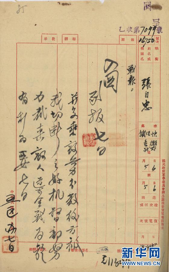 1940年5月5日,第三十三集团军总司令张自忠报告战况致蒋介石电。 9月14日,国家档案局在其官网发布了《浴血奋战——档案里的中国抗战》第二十一集:枣宜会战。 新华社发(中国第二历史档案馆提供)