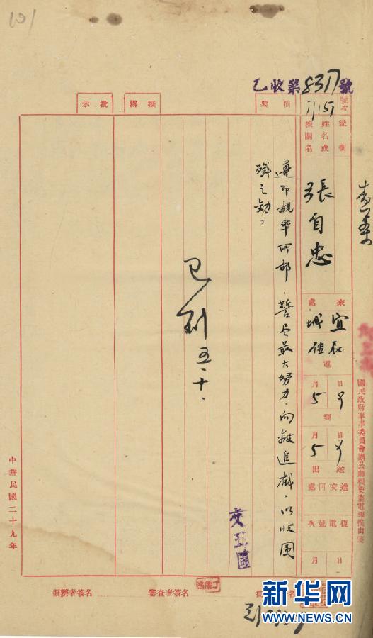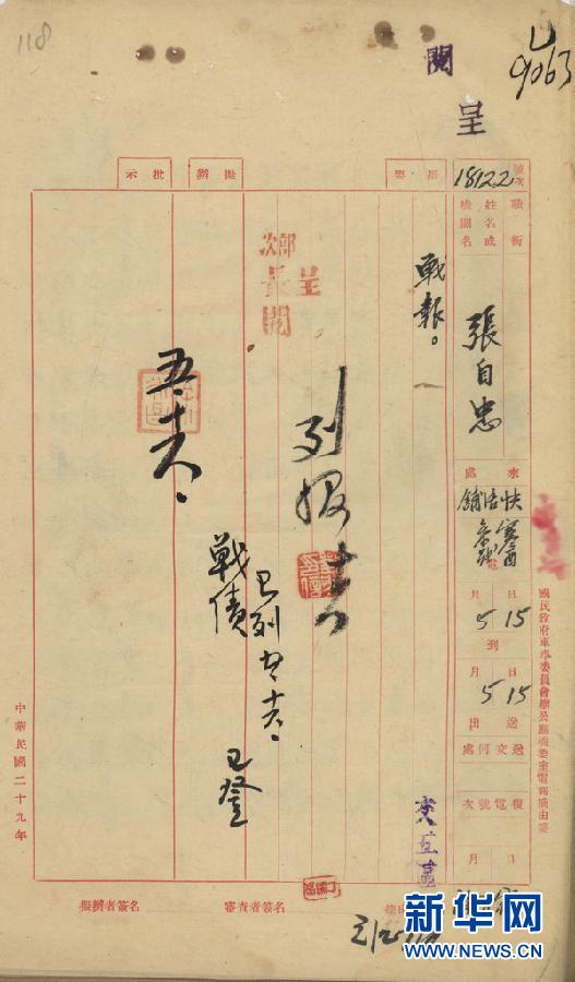 1940年5月9日,第三十三集团军总司令张自忠报告率部亲征致蒋介石电。 9月14日,国家档案局在其官网发布了《浴血奋战——档案里的中国抗战》第二十一集:枣宜会战。 新华社发(中国第二历史档案馆提供)