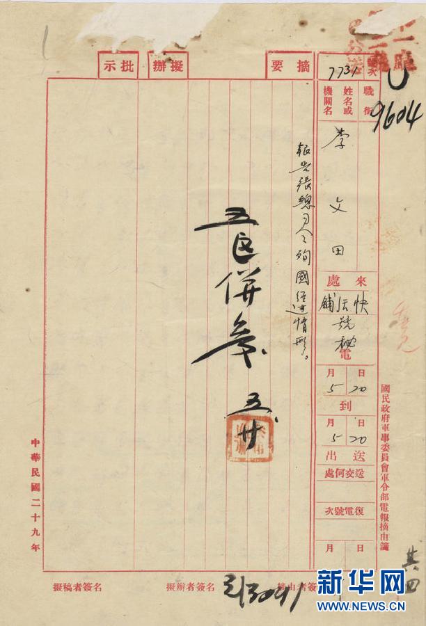 1940年5月19日,第三十三集团军参谋长李文田报告总司令张自忠殉国经过致军令部部长徐永昌电。 9月14日,国家档案局在其官网发布了《浴血奋战——档案里的中国抗战》第二十一集:枣宜会战。 新华社发(中国第二历史档案馆提供)