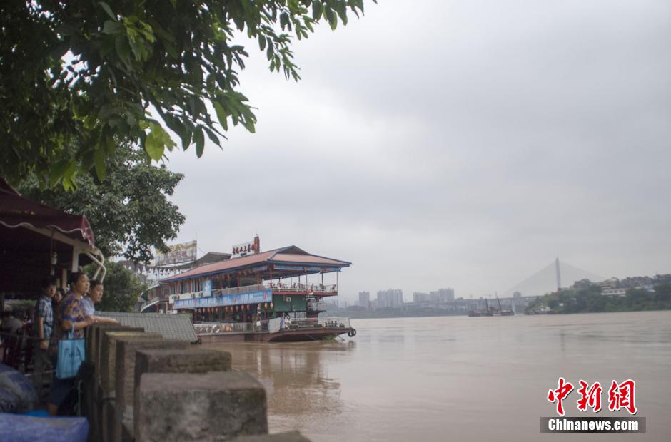 9月15日,长江、嘉陵江今年最大洪峰过境重庆主城,千年古镇磁器口水面暴涨,导致江边部分摊位和建筑被洪水淹没,磁器口派出所民警在危险地段和路口设置了警示标志及警戒线,提醒游客注意安全。图为今年最大洪峰过境重庆主城,民警在磁器口危险路段拉起警戒线。钟欣 摄