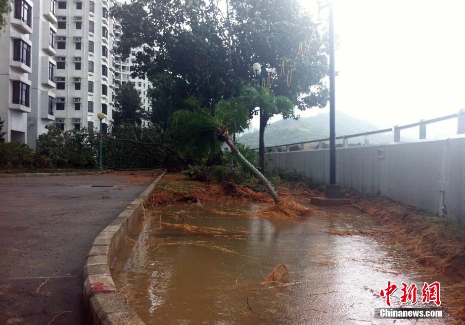 9月16日晨,受台风“海鸥”影响,香港悬挂8号风球,香港岛东部杏花邨海岸边积水严重。中新社发 张宇 摄
