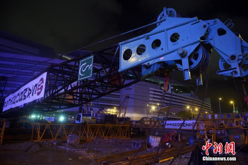 9月15日22点30分,香港发出8号东南列风或暴风信号。天文台表示,台风“海鸥”集结在香港以南约370公里,预计向西北偏西移动,并于香港300公里外掠过。图为16日零晨,湾仔码头工地的吊车放倒,进入安全戒备状态。中新社发 张宇 摄