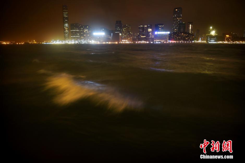 9月15日22点30分,香港发出8号东南列风或暴风信号。天文台表示,台风“海鸥”集结在香港以南约370公里,预计向西北偏西移动,并于香港300公里外掠过。图为16日零晨,维港风浪加大。中新社发 张宇 摄