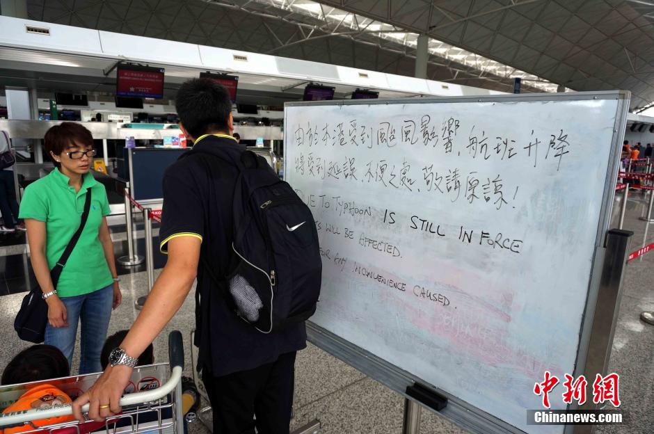 9月16日中午,香港受到8号强台风“海鸥”袭击过后 ,海陆空交通逐渐恢复正常。香港航空表示,由于实施航空交通管制,当天的航班预计仍然出现延误。图为机场贴出告示提醒旅客注意。中新社发 洪少葵 摄