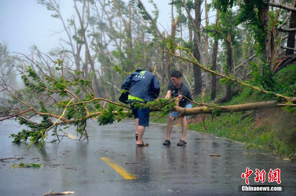 9月16日,据中央气象台消息,今年第15号台风“海鸥”9时40分登陆海南文昌翁田附近沿海,之后12时45分前后在广东徐闻南部沿海再次登陆,登陆时中心附近最大风力为13级(40米/秒)。图为在海南省文昌市翁田镇,记者清除横倒在路中的大树。中新社发 骆云飞 摄