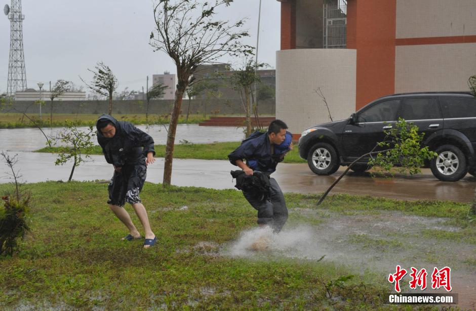 9月16日,据中央气象台消息,今年第15号台风“海鸥”9时40分登陆海南文昌翁田附近沿海,之后12时45分前后在广东徐闻南部沿海再次登陆,登陆时中心附近最大风力为13级(40米/秒)。图为在海南省文昌市翁田镇明月小学临时安置点,两位记者冒狂风采访。中新社发 骆云飞 摄