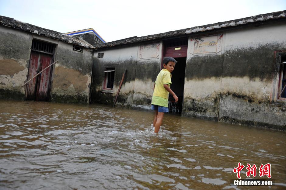 9月16日,今年第15号台风“海鸥”当日9时40分在海南文昌市翁田镇沿海登陆后,兴风作浪,琼北沿海发生天文潮,东寨港的防潮堤决口20余处,潮水漫堤,罗豆农场再遭其害,已致13村庄被淹,转移5000多人。图为文昌市罗豆农场东溪村一位小朋友涉水回家。中新社发 骆云飞 摄