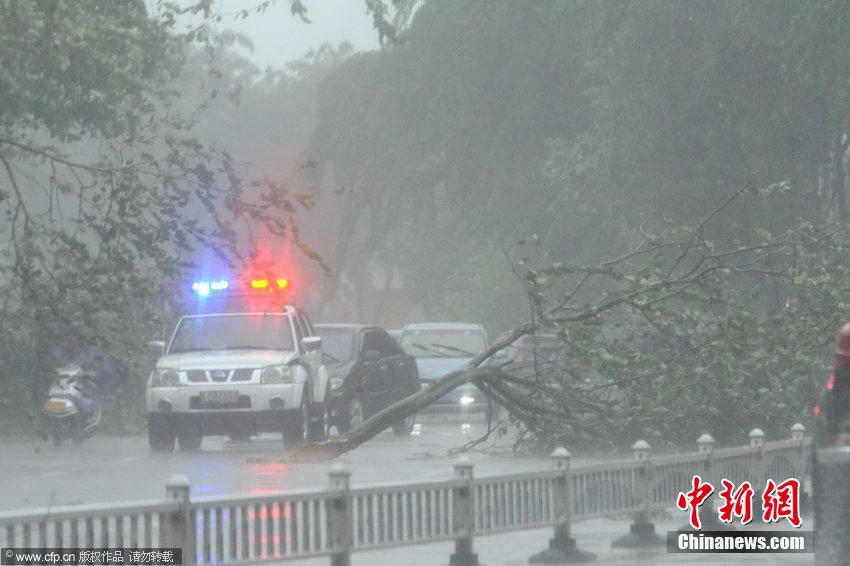 2014年9月16日,海南琼海,车辆在一片狼籍的马路上行驶。据中央气象台消息,16日至18日,广西南部、海南、广东南部、云南东南部等地的部分地区有大到暴雨,其中广西南部、海南、广东西南部、云南东南部的部分地区有大暴雨,海南北部和西部、广西东南部的局部地区有特大暴雨。图片来源:CFP视觉中国