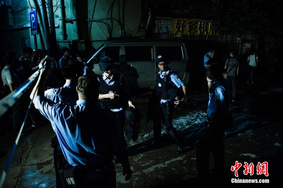 9月17日凌晨,全副武装的民警走出案发现场。据广州警方16日晚间通报称,16日傍晚18时许,广州市海珠区南田路一座民居发生一起枪击事件,警方缉捕毒贩时遭对方开枪射击,民警立即开枪还击,随后嫌疑人退回屋内并点燃物品与民警对峙。期间造成1名民警受伤,1名群众因伤重不治身亡。当晚24时许,特警采取强攻措施破门入屋,嫌疑人黄某被警方当场击毙。 中新社发 龙宇阳 摄