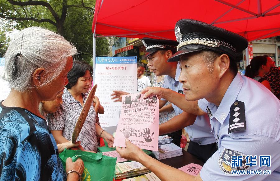 9月16日,武夷山火车站派出所民警在湖桃社区向居民宣传铁路安全知识。 国庆旅游黄金周临近,福建省武夷山铁路部门深入当地辖区,开展保人身安全、保牲畜安全、保行车安全“三保”宣传活动,提高铁路沿线居民安全意识,严格遵守铁路安全规则,确保铁路运行安全。新华社发(邱汝泉摄)