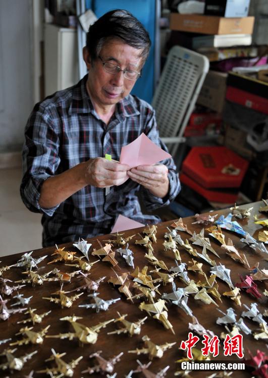 9月17日,成都市70岁的小学退休教师许树全,60年来用废纸折出了上万余只各种系列的“飞机”,包括中国的歼系列、运输机、预警机、客机等多个品种。老人还用废纸折出了生动的人、马以及生肖系列。“我最大的愿望就是能办一个自己的展览,让更多的人了解中国民间传统的折纸手艺。”许树全称。刘忠俊 摄