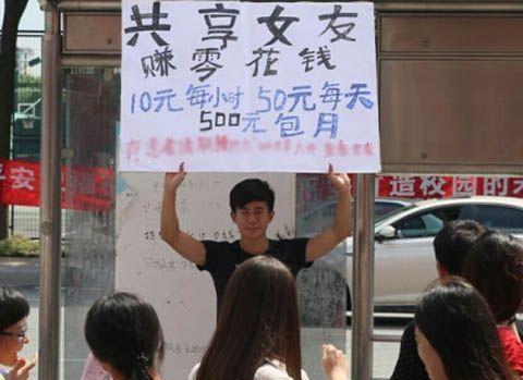 9月15日下午3时许,一名自称大一新生的男子在文汇路附近举牌:“共享女友,赚零花钱。”牌子下方明码标价:“10元每小时,50元包天,500元包月,共享服务项目包括自习室占座、逛街、打游戏……”小伙子说,只要连接wifi共享热点,就能看到女友资料,还能一睹“女友真颜”。
