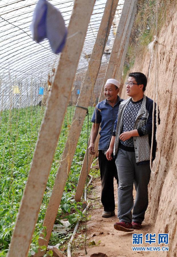 在宁夏回族自治区固原市原州区黄铎堡镇丰泽村,李浩在村民的温棚内走访(9月15日摄)。