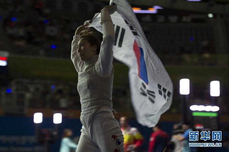 9月21日,韩国选手全希叔夺冠后庆祝胜利。当日,在2014仁川亚运会女子个人花剑决赛中,韩国选手全希叔以15比6战胜中国选手乐慧林,夺得冠军。 新华社记者吕小炜摄