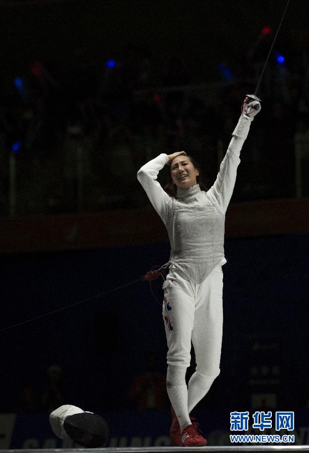 9月21日,韩国选手全希叔庆祝夺冠。当日,在2014仁川亚运会女子个人花剑决赛中,韩国选手全希叔以15比6战胜中国选手乐慧林,夺得冠军。 新华社记者吕小炜摄
