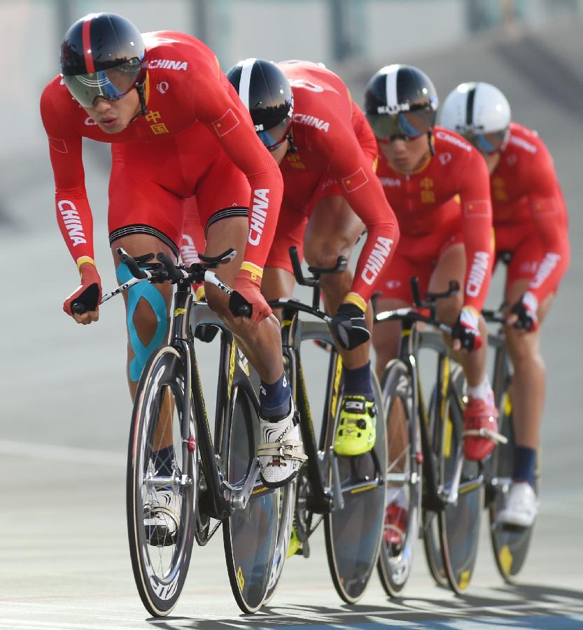 9月21日,中国队选手刘浩(前)及队友在比赛中。当日,在2014仁川亚运会场地自行车男子团体追逐赛中,中国队以4分07秒936的成绩获得冠军。 新华社记者黄宗治摄