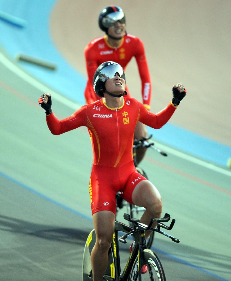 9月21日,中国队选手师涛(左)、刘浩(中)和秦晨路在比赛中。当日,在2014仁川亚运会场地自行车男子团体追逐赛中,中国队以4分07秒936的成绩获得冠军。 新华社记者黄宗治摄