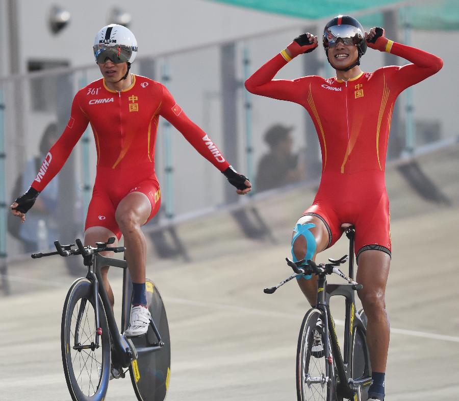当日,在2014仁川亚运会场地自行车男子团体追逐赛中,中国队以4分07秒936的成绩获得冠军。 新华社记者卢炳辉摄